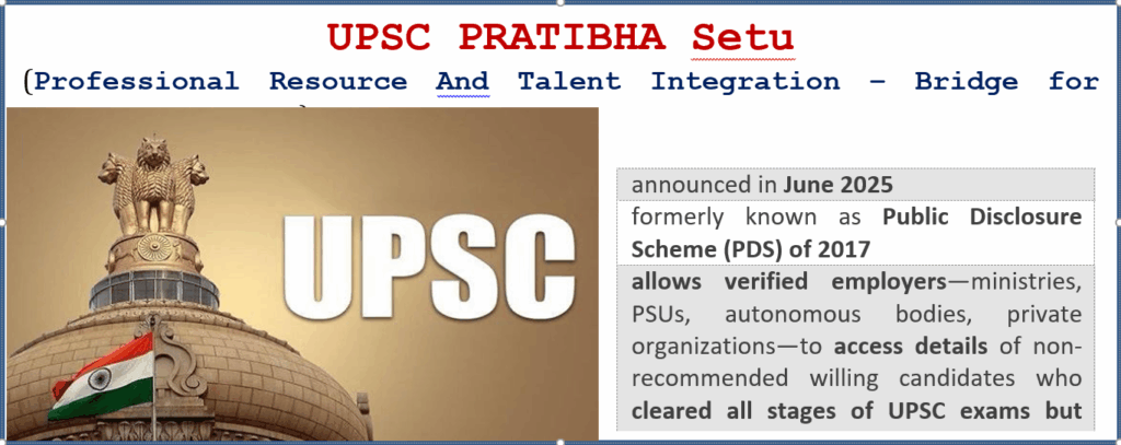 - The UPSC’s Professional Resource And Talent Integration Bridge for Hiring Aspirants (PRATIBHA) Setu initiative, is facilitating employment opportunities for those who reach the interview stage but are unable to make it in the final list.