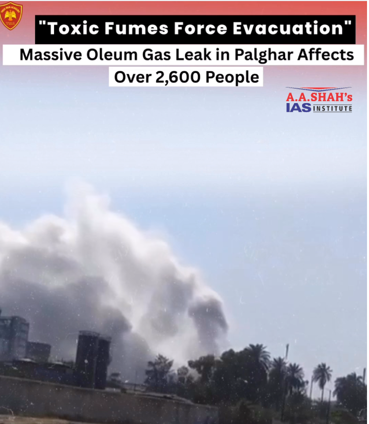 - A major leak of hazardous oleum gas at a chemical unit in Maharashtra’s Palghar district led to the evacuation of over 2,600 people, including 1,600 school students, while three persons complained of minor eye irritation, officials said.