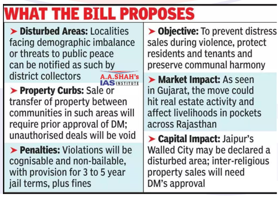 Rajasthan passes Bill to regulate property sales in ‘disturbed areas’ POLITY – BILL/ACT 7 MARCH 2026 Disturbed Area