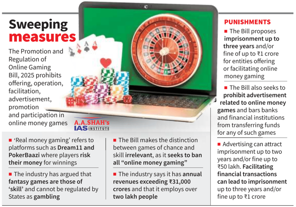 - The rules come as subordinate legislation for the Promotion and Regulation of Online Gaming Act, 2025, which prohibited real money gaming in India.