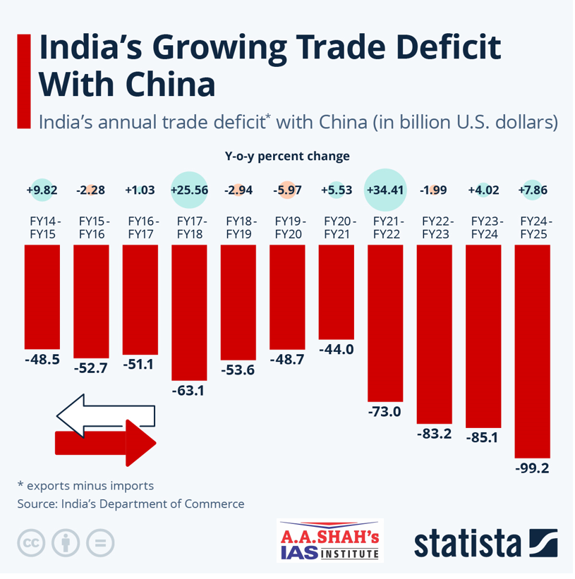 - India’s trade deficit with China had widened to $99.2 billion during the year 2024-25.