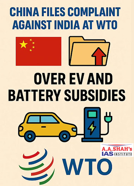 - China has filed a complaint against India in the World Trade Organization (WTO) over India’s subsidies for electric vehicles (EVs) and batteries.