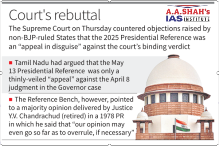 - Tamil Nadu and Kerala argued the Reference was an “appeal in disguise”. This divergence may open the path for the government to take the Presidential Reference route against an uncomfortable apex court judgment in future, rather than opting to file review or curative petitions.