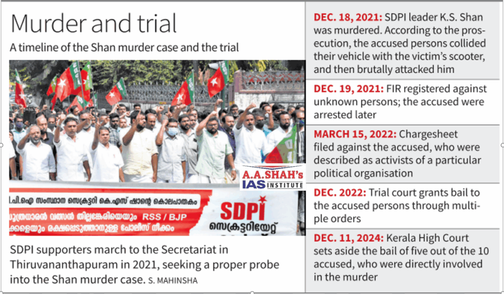 - Shan was murdered in 2021 while returning home on his motorcycle. The attack was said to be a retaliatory act following the killing of an RSS worker, allegedly by SDPI activists.