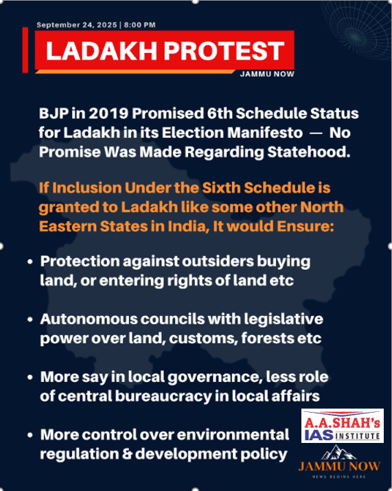 - For the past five years, civil society groups have been demanding protection of land, resources and employment for Ladakh.