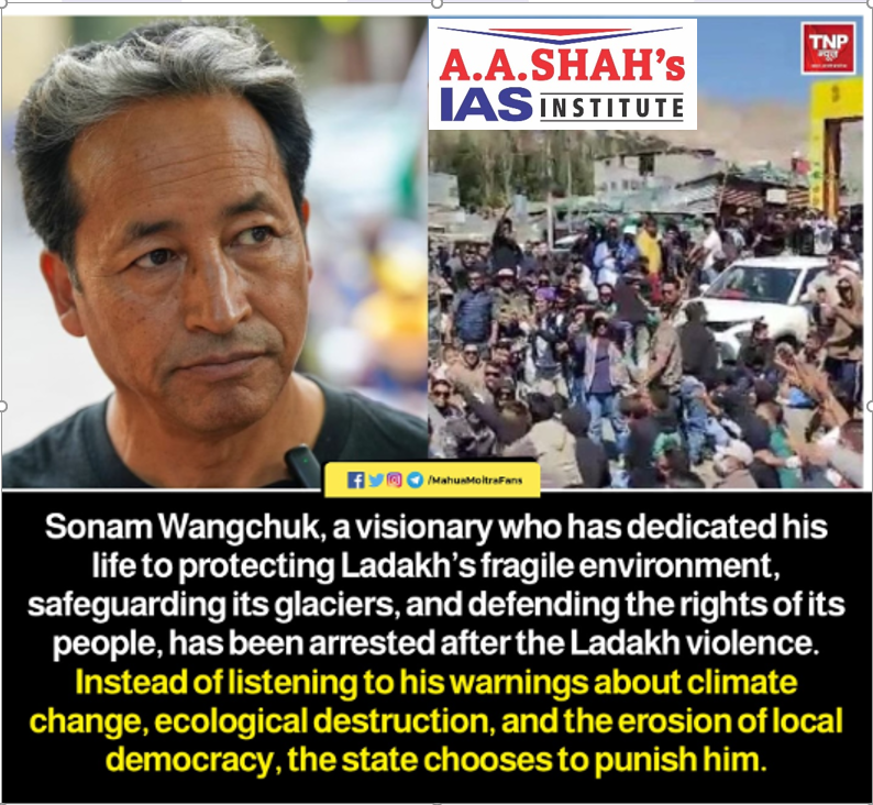 - On September 26, 2025, prominent educationist and climate activist of Ladakh, Sonam Wangchuk, was detained under the National Security Act (NSA), 1980 for disrupting public order. He has been transferred from Leh to a jail in Jodhpur.