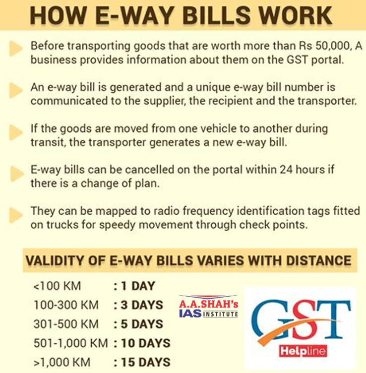 - An e-way bill (electronic way bill) is a document generated online for the movement of goods worth more than a specified value (₹50,000 in India) from one place to another.