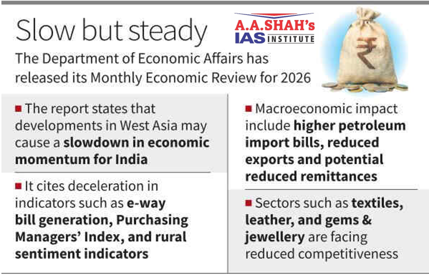 - The Monthly Economic Review for March 2026, released by the Department of Economic Affairs (DEA), noted that the evolving conflict has “introduced a complex and multi-layered set of risks” for India, which is a major energy importer with strong trade, investment, and remittance linkages with West Asia.