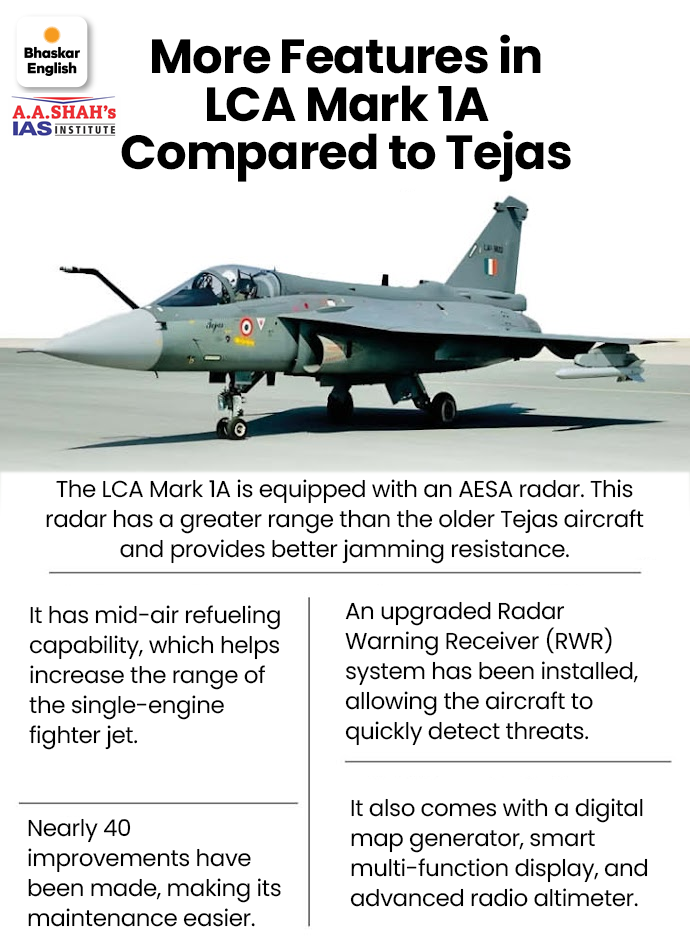 • Key upgrades include integration of UTTAM Active Electronically Scanned Array (AESA) Radar, Swayam Raksha Kavach electronic warfare suite, and indigenous control surface actuators, reinforcing the government’s Atmanirbhar Bharat (self-reliant India) initiative.