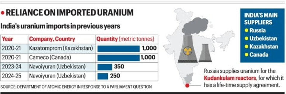 - Aside from the Cameco deal, India also finalised a supply agreement with Kazatomprom of Kazakhstan in February 2026, and has ongoing contracts with Uzbekistan and Russia (both with low-grade ore).