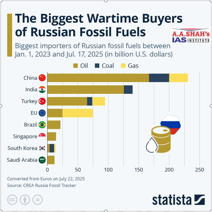 - Despite accusations against multiple countries and the fact that China imports more Russian energy than India, the U.S. has singled out India by imposing “penalty tariffs” of 25%, effectively doubling the tariffs on Indian goods.