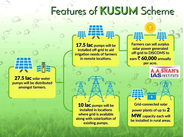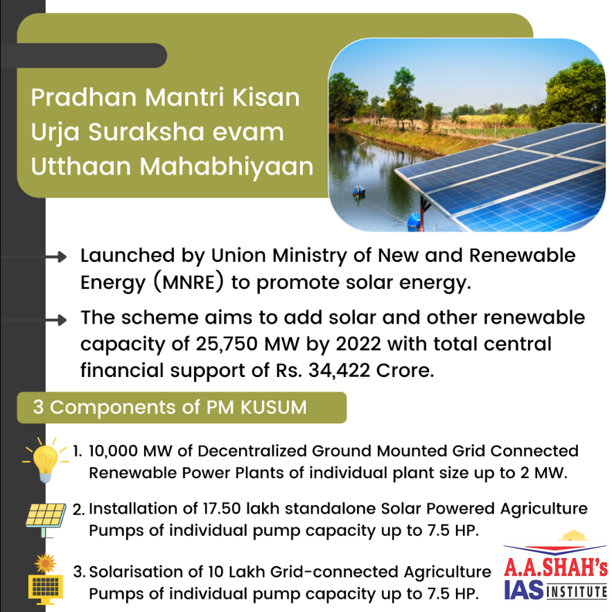 • The ₹34,000-crore PM-KUSUM programme is meant to boost solar energy infrastructure in agriculture by setting up 100 GW of solar power plants in farmer-owned land.