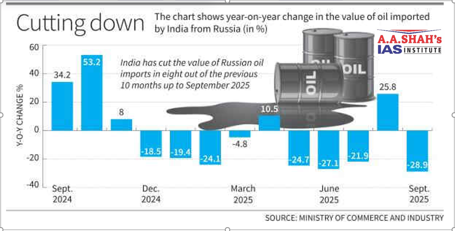 • Russian oil accounted for about 41% of India’s total oil imports in September 2024, which came down to 31% by September 2025.
