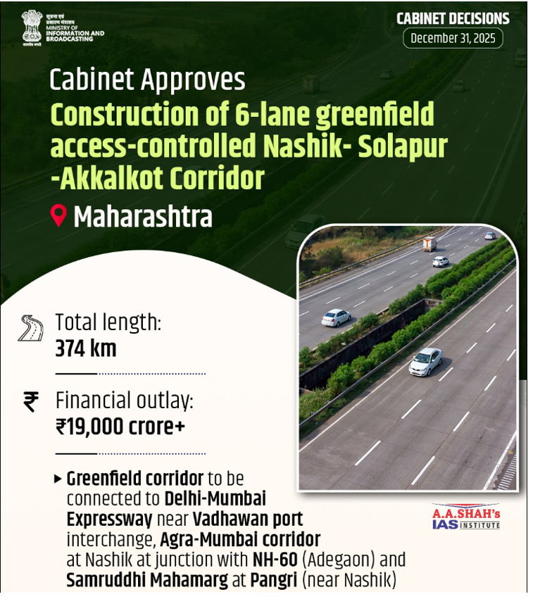 - The Union Cabinet approved the construction of a six-lane, greenfield, access-controlled Nashik-Solapur-Akkalkot corridor in Maharashtra on Build-Operate-Transfer (BOT) mode.