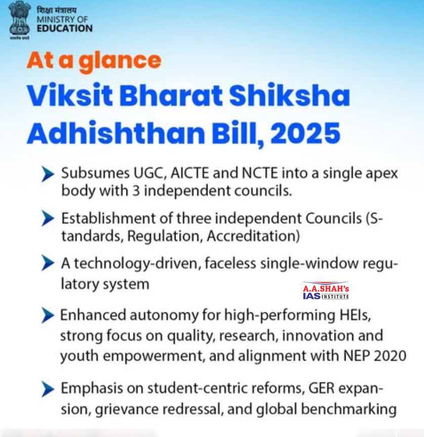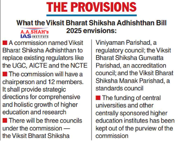 - The Bill proposes to subsume these bodies, and the National Council for Teacher Education (NCTE) into a single 12-member Commission, under which three separate Regulatory, Accreditation, and Standards Councils will operate.
