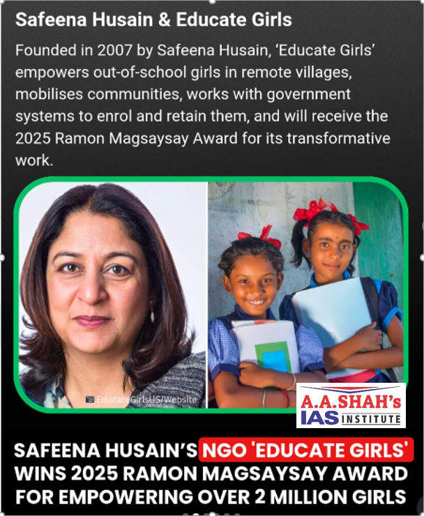 - Educate Girls, an Indian non-profit organisation working to educate unprivileged girls across the country, has been named as one of the three winners of the Ramon Magsaysay Award, 2025.