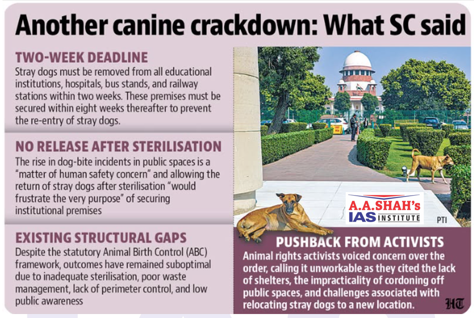 - The directions were issued in the suo motu proceedings aimed at framing a national framework for stray dog management and ensuring compliance with existing regulations.