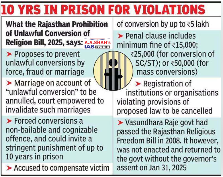 - The Rajasthan Prohibition of Unlawful Conversion of Religion Act, 2025 was passed by the State Assembly in September 2025.