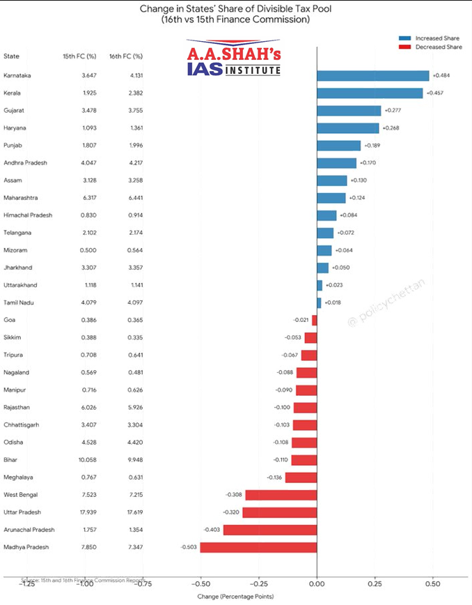 - The 16th Finance Commission has raised the share for five Southern States — Tamil Nadu, Kerala, Andhra Pradesh, Telangana, and Karnataka.