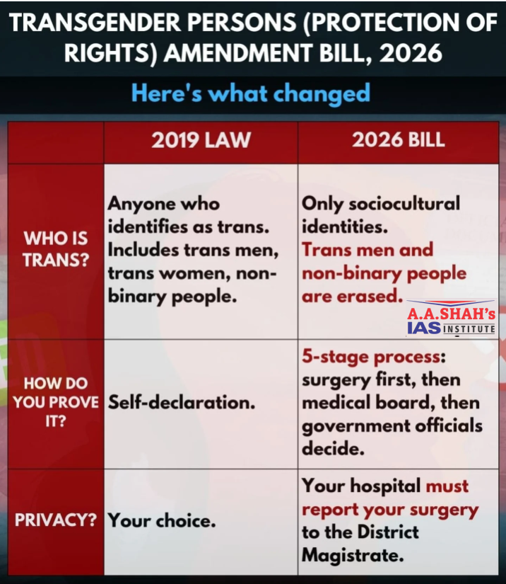 - The government has introduced a new amendment Bill (2026) to change parts of the Transgender Persons (Protection of Rights) Act, 2019.