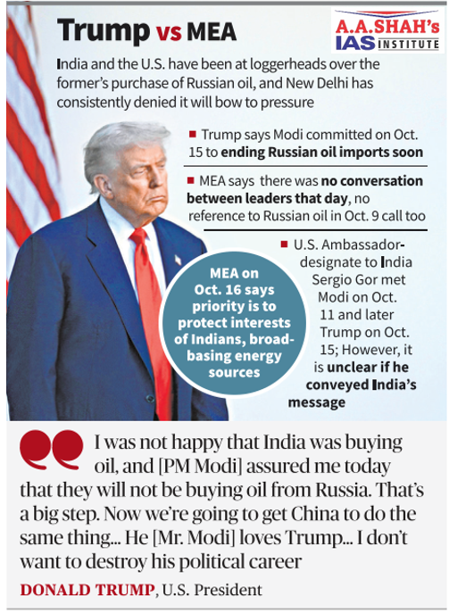 • India and the United States continued to differ publicly over Russian oil as U.S. President Donald Trump said he had been assured by Prime Minister Narendra Modi that India will stop buying oil from Russia, while the Ministry of External Affairs maintained the two leaders had not spoken about the issue.