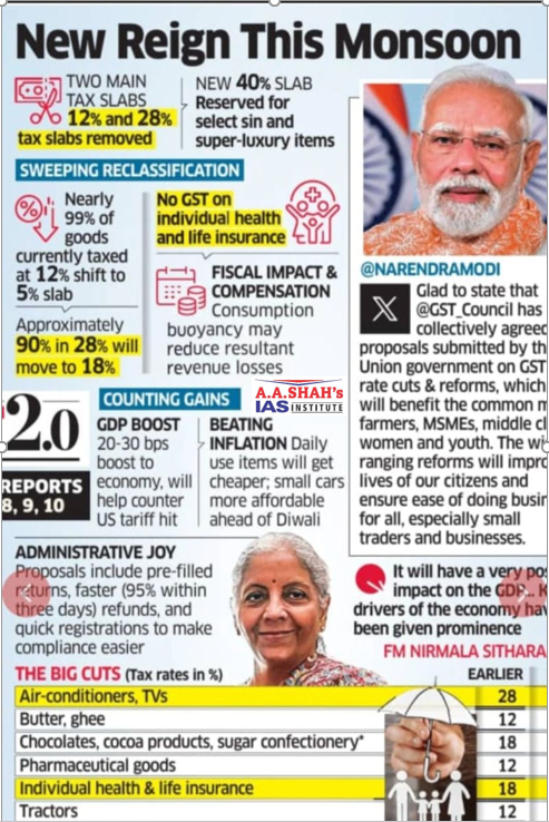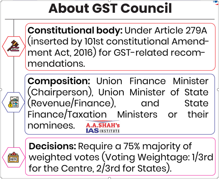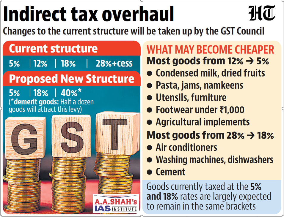 - The Goods and Services Tax (GST) Council, during its 56th meeting, decided to revamp the tax structure into a primarily two-rate system, as proposed by the Central government.