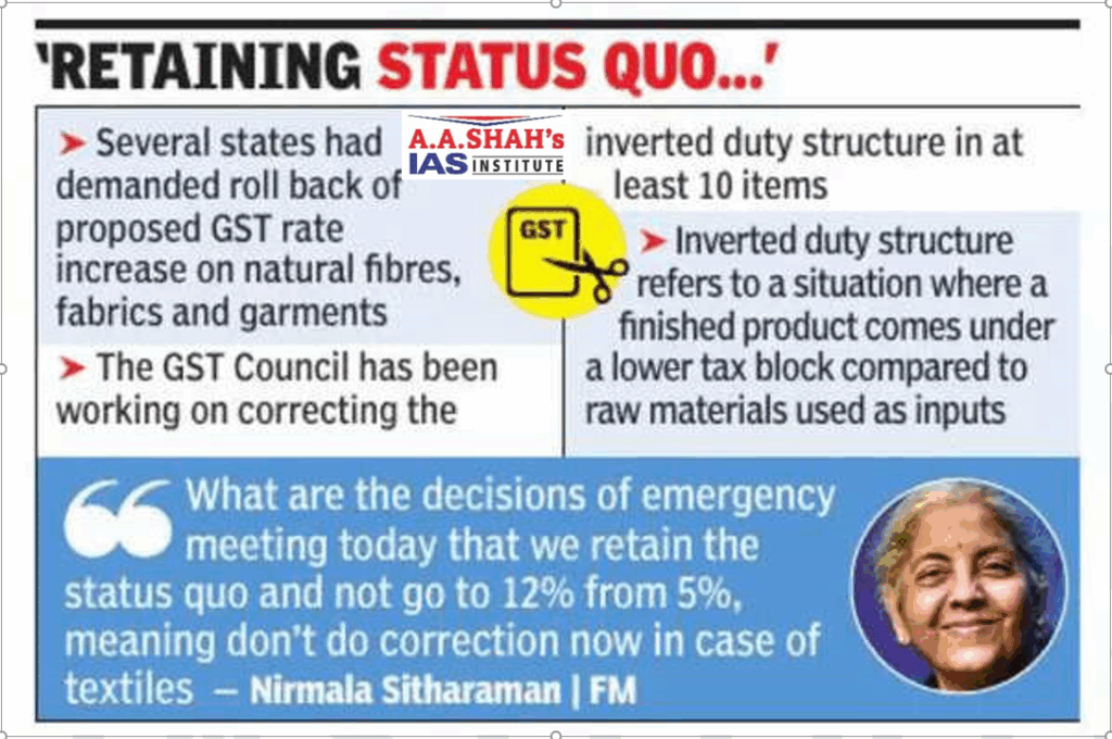 - “The long-pending inverted duty structure is being rectified for the manmade textile sector by reducing the GST rate on manmade fibre from 18% to 5% and manmade yarn from 12% to 5%,” Ms. Sitharaman said. “That will take care of every anomaly due to duty inversion in this sector.”