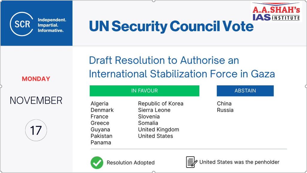 - The U.S. resolution that passed the UN Security Council authorises an International Stabilisation Force to provide security in Gaza, approves a transitional authority to be overseen by President Donald Trump and envisions a possible future path to an independent Palestinian state.
