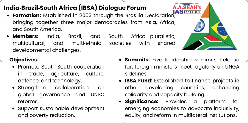 - The Prime Minister said the IBSA was not just a group of three countries but an important platform connecting three continents, three major democratic nations, and three major economies; promoting South-South cooperation.